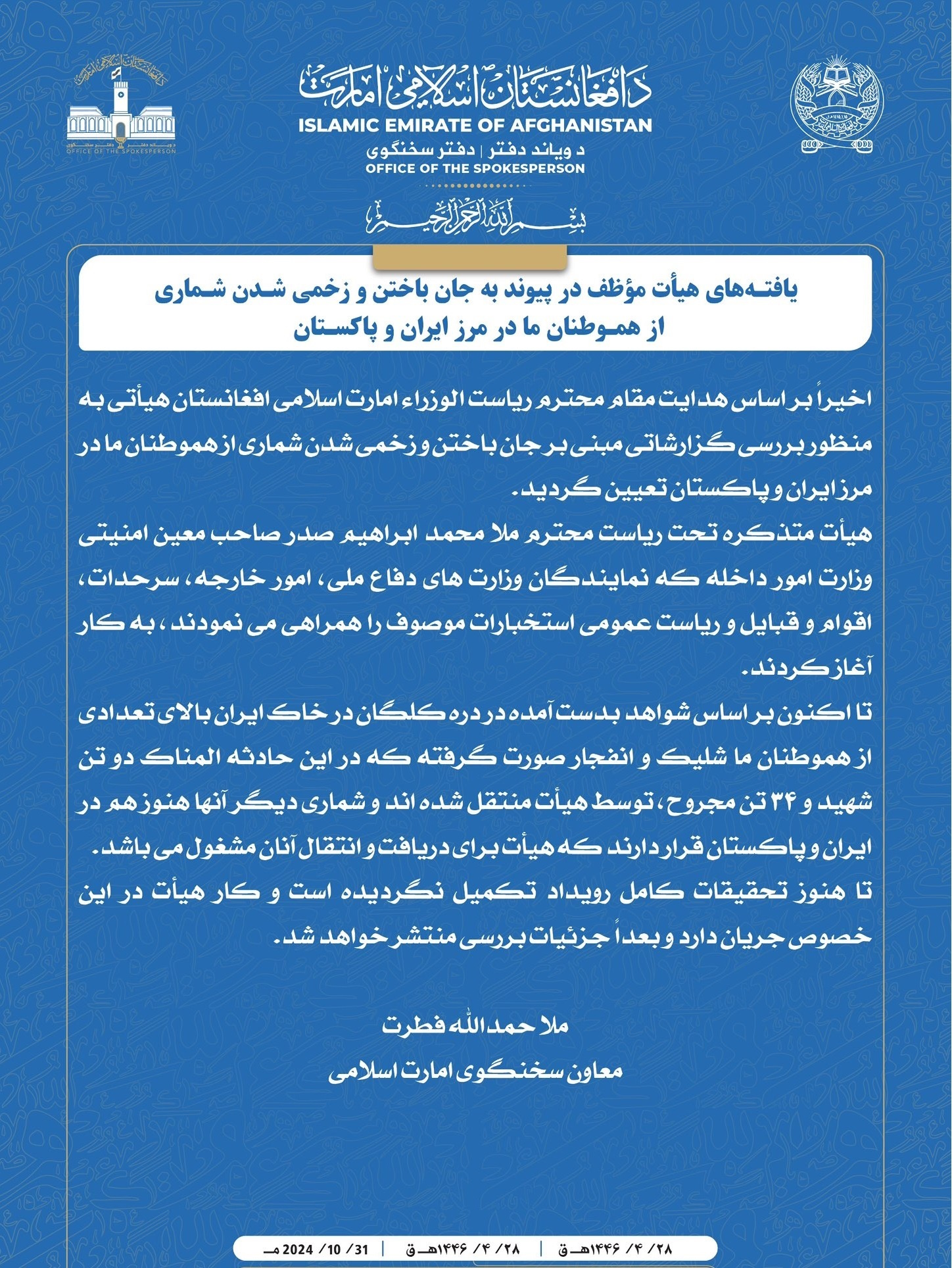 هیأت متذکره تحت ریاست محترم ملا محمد ابراهیم صدر صاحب معین امنیتی وزارت امور داخله که نمایندگان وزارت های دفاع ملی، امور خارجه، سرحدات، اقوام و قبایل و ریاست عمومی استخبارات موصوف را همراهی می نمودند، به کار آغاز کردند. تا اکنون بر اساس شواهد بدست آمده در دره کلگان در خاک ایران بالای تعدادی از هموطنان ما شلیک و انفجار صورت گرفته که در این حادثه المناک دو تن شهید و ۳۴ تن مجروح، توسط هیأت منتقل شده اند و شماری دیگر آنها هنوز هم در ایران و پاکستان قرار دارند که هیأت برای دریافت و انتقال آنان مشغول می باشد. تا هنوز تحقیقات کامل رویداد تکمیل نگردیده است و کار هیأت در این خصوص جریان دارد و بعداً جزئیات بررسی منتشر خواهد شد. دراین میان سخنان آقای سید عباس عراقچی وزیر خارجه جمهوری اسلامی ایران با یک شبکه تلویزیونی افغانی در عین حالیکه درد ناک بوده در مغائرت با اظهارات امروز آقای اسمعیل بقائی سخنگوی وزارت امور خارجه بوده که گفته بود ، مسلمأ حادثه بسیار بدی بود وتأثرهمه ایرانیان را برانگیخت ، از جمله خود من ! این حادثه بسیار غم انگیز بود …… طنز تاریخ آنجاست که یکی از بلندرتبه ترین مقامات عرصه ء دیپلوماسی یعنی آقای سید عباس عراقچی که تازه بر کرسی وزارت امور خارجه جمهوری اسلامی ایران جلوس نموده است راجع به حادثه درناک کشتار جمعی افغانها در مرز کلگان سراوان ایران با کلیمات درد آوری یاد آوری می نمایند و چنانچه می بینید و می شنوید خود اعتراف میکند که : مسلمأ حادثه ء بسیار بدی بود و تأثر همه ایرانیان را برانگیخت ؛ ازجمله خودمن !این حادثه بسیار غم انگیز بود ولی حادثه ای بود که ممکن بود برای ایرانی ها نیز پیش بیاید ……خود شما فرمودید میلیونها افغانی در ایران در طول تقریبأ چهل سال گذشته زندگی کرده اند . چگونه ممکن است که اگر هدایت و فرمان از جائ و مرکز دیگری ازقدرت آنهم بخا طر حفظ نظام که پاسداری از آن در نزد برخی رجالی معتقد بر ولایت فقیه مطلقه از واجبات و فرائض نامیده میشود صادر نه می شود تضاد در مواضع این دومقام دیپلماسی جمهوری اسلامی ایران به مشاهده برسد .واقیعت این است که مردم فقیر و ستمدیده افغانستان وقتی از دست ظلم و استبداد رژیم استخباراتی طالبان به سویی مرزها و کشور های همسایه که خود را به غلط مسلمان می نامند با گذراز کوه ها و دریا ها عبور میکنند با شدید ترین عذاب ها و شکنجه ها روبرو میگردند .