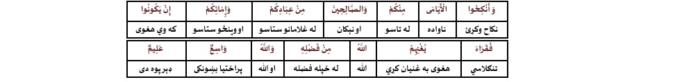 وَأَنْكِحُوا الْأَيَامَى مِنْـكُمْ وَالصَّالِحِينَ مِنْ عِبَادِكُمْ وَإِمَائِكُمْ إِنْ يَكُونُوا فُقَرَاءَ يُغْنِهِمُ اللَّهُ مِنْ فَضْلِهِ وَاللَّهُ وَاسِعٌ عَلِيمٌ﴿۳۲﴾له تاسو خپلو څخه ناواده کړو[جره ګانو] ته(۲۸)، وړ او صالحو غلامانو او وينځو ته نکاح وکړئ، که څه هم فقیر او اړمن وي [او د واده او کورنۍ د تشکیل د مصارفو په اړه تشویش ولري]، الله به هغوی له خپله فضله غنیان [نااړمن او بې نیازه] کړي او الله پراختیا بښونکی، ډېر پوه دی.