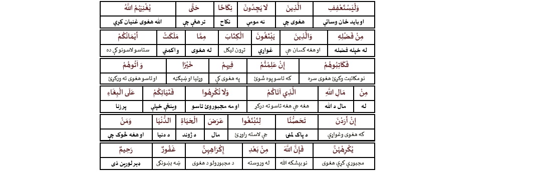 وَلْيَسْـتَعْفِفِ الّـَذِينَ لَا يَجِدُونَ نِكَاحًـا حَـتّـَى يُغْنِيَهُـمُ اللَّهُ مـِنْ فَـضْلِهِ وَالّـَذِينَ يَبْتَغُونَ الْكِتَابَ مِمَّا مَلَكَتْ أَيْمَانُكُمْ فَكَاتِبُوهُمْ إِنْ عَلِمْتُمْ فِيهِمْ خَـيْرًا وَآتُوهُمْ مِنْ مَالِ اللَّهِ الّـَذِي آتَاكُمْ وَلَا تُكْرِهُوا فَتَيَاتِكُمْ عَلـَى الْبِغَاءِ إِنْ أَرَدْنَ تَحَصُّنًا لِتَبْتَغُوا عَرَضَ الْحَيَاةِ الـدُّنْيَا وَمَنْ يُكْرِهْهُنَّ فَإِنَّ اللَّهَ مِنْ بَعْدِ إِكْرَاهِهِنَّ غَفُورٌ رَحِيمٌ﴿۳۳﴾او هغه کسان چې، نکاح [لپاره وسه] نه پیدا کوي، باید [د جره توب په شرایطو کې] ځان وساتي [او پاک لمنې خپله کړي] تر هغه [مهاله چې] الله په خپل فضل دوی غني [بې نیازه او وسمن] کړي. او هغه کسان چې ستاسو تر واک لاندې دي، او [د خپلې آزادۍ د بیرته اخيستلو او پیرودلو لپاره] د تړون د تنظيم غوښتونکي وي، که په هغوي کې کوم خیر [او ښېګڼه] وینئ، ويي منئ او [حتا] د الله له ماله چې تاسو ته يي در کړی دی [د هغوی د خوشې کولو لپاره] تادیه کړئ.(۲۹) او هغه اسیرې ښځې چې په واک کې لرئ، که د پاک لمنۍ[= د کورنۍ د تشکیل] هوډ لري،(۳۰) هغوی تن پلورلو ته[په دې تمه] مه مجبوروئ چې تاسو د دنیوي ژوند ګټو ته ورسېږئ او هر څوک چې هغوی مجبورې کړي، نو الله له دې اجبار وروسته [په مجبور شوو کسانو] غفور او رحیم دی [بښونکی او مهربان دی].