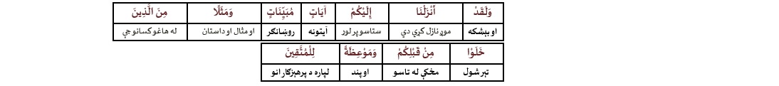 وَلَقَدْ أَنْزَلْنَا إِلَيْكُمْ آيَاتٍ مُبَيِّنَاتٍ وَمَثَلًا مِنَ الّـَذِينَ خَلَوْا مِنْ قَبْلِكُمْ وَمَوْعِظَةً لِلْمُتَّقِينَ﴿۳۴﴾او په تحقیق سره مونږ تاسو ته روښانه آیتونه او مَثَل [له پنده ډکو تجربو څخه نمونې] له هغو کسانو، چې تر تاسو د مخه ول، او موعظه [او پند] مود پرهېزګارانو لپاره نازل کړل. (۳۱)