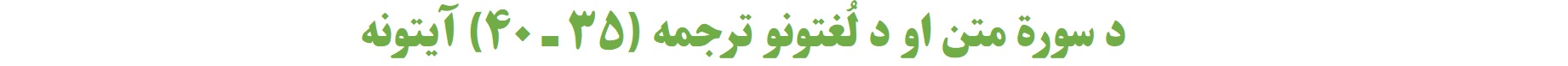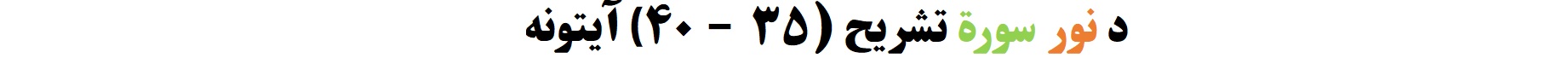 اللَّهُ نُورُ السَّمَاوَاتِ وَالْأَرْضِ مَثَلُ نُورِهِ كَمِشْكَاةٍ فِيهَا مِصْبَاحٌ الْمِصْبَاحُ فِي زُجَاجَةٍ الزُّجَاجَةُ كَأَنَّهَا كَوْكَبٌ دُرِّيٌّ يُوقَدُ مِنْ شَجَرَةٍ مُبَارَكَةٍ زَيْتُونَةٍ لَا شَرْقِيَّةٍ وَلَا غَرْبِيَّةٍ يَكَادُ زَيْتُهَا يُضـِيءُ وَلَوْ لَمْ تَمْسَسْهُ نَارٌ نُورٌ عَلَى نُورٍ يَهْدِي اللَّهُ لِنُورِهِ مَنْ يَشَاءُ وَيَضْـرِبُ اللَّهُ الْأَمْثَالَ لِلنَّاسِ وَاللَّهُ بِكُلِّ شَيْءٍ عَلِيمٌ ﴿۳۵﴾ فِي بُيُوتٍ أَذِنَ اللَّهُ أَنْ تُرْفَعَ وَيُذْكَرَ فِيهَا اسْمُهُ يُسَبِّحُ لَهُ فِيهَا بِالْغُدُوِّ وَالْآصَالِ﴿۳۶﴾رِجَالٌ لَا تُلْهِيهِمْ تِجَارَةٌ وَلَا بَيْعٌ عَنْ ذِكْرِ اللَّهِ وَإِقَامِ الصَّلَاةِ وَإِيتَاءِ الزَّكَاةِ يَخَافُونَ يَوْمًا تَتَقَلَّبُ فِيهِ الْقُلُوبُ وَالْأَبْصَارُ﴿۳۷﴾ لِيَجْزِيَهُمُ اللَّهُ أَحْسَنَ مَا عَمِلُوا وَيَزِيدَهُمْ مِنْ فَضْلِهِ وَاللَّهُ يـَرْزُقُ مَنْ يَشَاءُ بِغَيْرِ حِسَابٍ﴿۳۸﴾ وَالَّذِينَ كَفَرُوا أَعْمَالُهُمْ كَســَرَابٍ بِقِيعَةٍ يَحْسَبُهُ الظَّمْآنُ مَاءً حَتَّى إِذَا جَاءَهُ لَمْ يَجِدْهُ شَيْئًا وَوَجَدَ اللَّهَ عِنْدَهُ فَوَفَّاهُ حِسَابَهُ وَاللَّهُ سَرِيعُ الْحِسَابِ﴿۳۹﴾ أَوْ كَظُلُمَاتٍ فِي بَحْرٍ لُجِّيٍّ يَغْشَاهُ مَوْجٌ مِنْ فَوْقِهِ مَوْجٌ مِنْ فَوْقِهِ سَحَابٌ ظُلُمَاتٌ بَعْضُهَا فَوْقَ بَعْضٍ إِذَا أَخْرَجَ يَدَهُ لَمْ يَكَدْ يَرَاهَا وَمَنْ لَمْ يَجْعَلِ اللَّهُ لَهُ نُورًا فَمَا لَهُ مِنْ نُورٍ﴿۴۰﴾ مِشْكَاةٍ= څراغداني، ډیوټ، څراغځای، تاخچه چې څراغ پکې له باده د بچ کولو لپاره ږدي – مِصْبَاحٌ = یو څراغ – زُجَاجَة = ښيښه يي حباب، ښيښه يي کوبۍ، ښيښه يي پوکاڼه – كَوْكَبٌ = یو ستوری – دُرِّيٌّ = ځلاند – يُوقَدُ = بلېږي – شَجَرَةٍ = ونه – يَكَادُ = نژدې دی – زَيْتُهَا = تېل يې، غوړي يې – يُضـِيءُ = شعله ور شي، روښانه شي، لمبه شي – وَلَوْ لَمْ تَمْسَسْهُ = که څه هم هغه ته اور و نه رسېږي – بُيُوتٍ = کورونو کې – أَنْ تُرْفَعَ = چې [د هغوی نوم او مقام او جوړښت] پورته یوړل شي، لوړ شي – يُذْكَرَ = یاد شي – يُسَبِّحُ = د هغه تسبیح کوي – بِالْغُدُوِّ = په ګهیځ کې – الْآصَالِ = ماښام – رِجَالٌ = وګړي چې – لَا تُلْهِيهِمْ = هغوی نه غافلوي – تِجَارَةٌ = سوداګري – بَيْعٌ = راکړه ورکړه – إِقَامِ = ولاړول – إِيتَاءِ = ورکول – يَخَافُونَ = ډارېږي – تَتَقَلَّبُ = پړمخه اوړي، بل شان کېږي، بېتابه کېږي – الْأَبْصَارُ = سترګې – سـَرَابٍ = ځلوبی، اوبڅېر لِيَجْزِيَهُمُ = چې هغوی ته جزا ورکړي، چې هغوی ته اجر ورکړي – أَحْسَنَ = [په پرتله] بهترین – يَزِيدَهُمْ = پر [اجر د] هغوی ورزیات کړي، يَرْزُقُ = روزي ورکوي – بِقِيعَةٍ = بیدیا، دښته، بیابان – يَحْسَبُهُ = هغه انګېري – الظَّمْآنُ = تږی – لَمْ يَجِدْهُ = هغه نه مومي – وَفَّاهُ = په بشپړه توګه ورکوي – بَحْرٍ = یو سمندر – لُجِّيٍّ = ژور او پراخ – يَغْشَاهُ = نغاړي – مَوْجٌ = څپه – سَحَابٌ = یو لړ ورېځې – أَخْرَجَ = راوباسي – لَمْ يَكَدْ يَرَاهَا = داسې نـه دی چې [څوک] هغه وویني – لَمْ يَكَدْ = شونی نه دی، نژدې نه دی – فَمَا لَهُ = نو د هغه لپاره نشته –