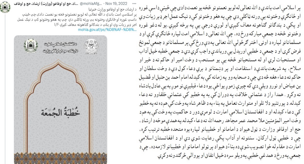 جمعه بصورت متحد خطبه بنام امارت اسلامی وشخص ملا هیبت الله آخندزاده قرئت کنند و اکثریتی از مساجد شهر کابل نیزازاین امر پیروی نمودند اما نه به دلیل اینکه صدوراین گونه فرامین دیکتاتورانه که خلاف روح حقیقی اسلام اند بلکه با داشتن مزاج دیکتاتورانه و غریزه ای خود خواهانه جناب حکمتیار که درمسیر تمامی زندگی سیاسی و فرهنگی ایشان بصورت واضح به مشاهده میرسد طی ملاقاتهای که با برخی از مقامات این گروه انجام داده بود و منجر به نتیجه مطلوبی در باره صدور این فرمان نه شد دستور داد تا وضعیت کنونی را یک کرونای دیگری تلقی کند و سرانجام دستور توقف نماز های حمعه را طبق معمول تا “امر ثانی !!” را صادر نمود