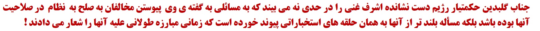 اگرتمامی مدافعان گفتمان حاکم برجناب گلبدین حکمتیاریکصدا متحد شوند وبگویند که اندیشه مادی جناب حکمتیار برروح اکثریتی ازهواداران شان که در مجموعه ای موسوم به حزب اسلامی افغانستان گردهم آمده است حاکم نیست بلکه این نظر شخصی وی بوده است نه میتوانند از آنچه که جناب حکمتیار به زبا ن صریح و بی پرده پس از اجلال نزول اش در پاسخ یکی از ژورنالیست های افغان به زبان آورد انکار کنند .چنانچه هیچکسی نه میتواند از هدف اصلی مخالفت جناب گلبدین حکمتیار با نظام کفر و فساد را که به تصؤر ایشان گویا ماهیانه مبالغ هنگفتی را از حکومت اشرف غنی با توجه به معاهده ای که با حزب اسلامی به امضا رسیده بود حاصل میکرد منکر شود .