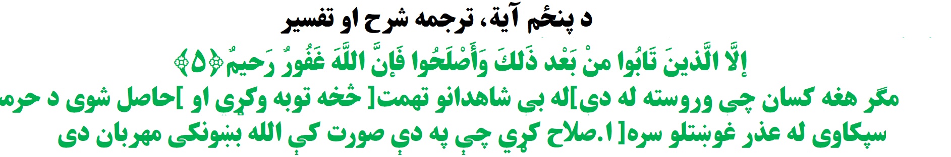 «إِلَّا الَّذِينَ تَابُوا مِنْ بَعْدِ ذَلِكَ وَأَصْلَحُوا» مګر هاغه کسان چې، له دې کاره وروسته توبه وکړي، او اصلاح وکړي. وايي که یو تهمت او تور يې پر یوې ښځې لګولی وي، او بیا بښنه وغواړي، او ووايي؛ چې ما اشتباه کړې وه، او خپله اشتباه جبران کړي. د «تَابُوا» جملې له ذکر وروسته د «وَأَصْلَحُوا» جمله، دې حقیقت ته اشاره کوي؛ چې باید دا ډول وګړي، له خپلې ګناه توبه وکړي. او کوم فساد يې چې کړی دی، د هغه د اصلاح په مقام کې راووځي. «فَإِنَّ اللَّهَ غَفُورٌ رَحِيمٌ» خدای تعالی غفور او رحیم دی. دا قاعدتاً په دې آیت پسې راغلی، او باید په دې آیت کې شامل شي، چې که بې جهته يې پر چا تهمت لګولی وي، چې جبران شي. نو په دې آية کې هاغو کسانو ته اشاره ده، چې په پاک لمنو ښځو او مؤمنانو تور لګوي، خو ددې تهمت د اثبات لپاره څلور شاهدان نه راولي. نو دوی ته سربېره پر دې، چې هغوی اتیا ضربې دُرې ووهي، له هغوی د تل لپاره شهادت نه منل کېږي. او په آخرت کې، هم د جزاء مستحق دي. ځکه چې دوی فاسقان دي، خو هغه کسان چې له دې وروسته، د خدای تعالی په دُرشل کې توبه وکړي. ځکه چې دوی له تهمت لګولو سره له خدای تعالی نافرماني کړې ده، او هم له هاغه چا چې، پر هغه يې تور لګولی دی، عفو وغواړي. خپل حالت اصلاح کړي، ځکه چې د هغه حق يې ضایع کړی دی. بې له شکه خدای تعالی بښونکی لورين دی. سره له دې چې د شهادت نه منل، چې دنیوي سزا وه باقي پاته کېږي، ځکه چې هغه د شرعي حد برخه ده. او د جرم له ثبوت وروسته، شرعي حدّ په توبه نه ساقط کېږي.خو که په عام محضر کې، پر دې اقرار وکړي، چې متهم بېګناه دی، او دده تهمت په دروغو بنا وو. «توبه» یوازې استغفار او له تېره پښېماني، او حتا په راتلونکي کې، د هغه د ترک کولو هوډ نه دی، بلکې پر دوی ټولو سربېره ګنهګار وګړی، باید د جبران په مقام کې څرګند شي. که واقعاً د پاک لمنې ښځې یا نارینه حیثیت يې، رټن او داغدار کړی دی، د خپلې توبې د قبلېدو لپاره، باید خپلې خبرې، د هاغو کسانو پر وړاندې، چې دا خبرې يې د هغوی په اړه کړي دي، دروغ څرګندې کړي. او په اصطلاح د حیثیت اعاده وکړي. خو دا سمه نه ده چې یو نفر، څوک په عام محضـر کې [یا د مطبوعاتو او ټولنیزو رسنیو له لارې] په دروغجنه توګه، متهم او تورن کړي. او بیا په خپل کور کې، په خلوت کې استغفار وکړی، او د خدای تعالی له درشله، د عفوې او بښنې توبه وکړي. داسې یوه توبه به کله هم، د خدای تعالی په درشل کې و نه منل شي.