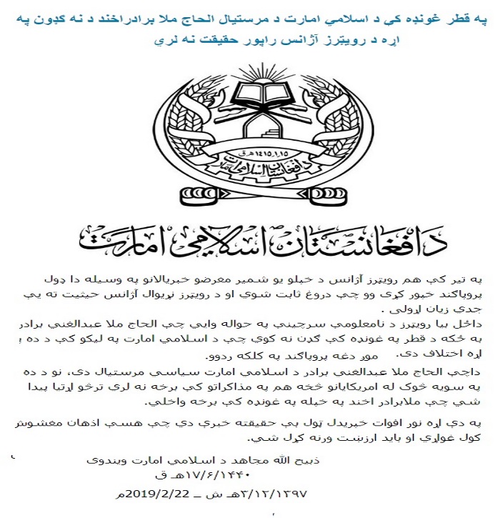 ( داچی الحاج مولوی برادر د اسلامی امارت سیاسی مرستیال دی، نو د ده په سویه څوک له امریکایانو څخه هم په مذاکراتو کې برخه نه لری ترڅو اړتیا پیدا شی چې ملابرادراخند په خپله په غونډه کې برخه واخلی. په دې اړه نورافوات خپریدل ټول بې حقیقته خبرې دی چې هسې اذهان مغشوش کول غواړی اوباید ارزښت ورنه کړل شی.