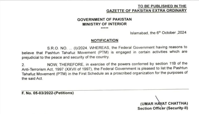 ددی سره سره چی د پاکستانی واکمن پوځ په لمسون د پښتنو د ژغورنې د غورځنګ لخوا د اکتوبر میاشتی په یولسمه نیټه د خیبر پښتونخوا په زړه پیښور کی دیوی لوی اعتراضی جرګی د جوړیدو په وړاندی داسی اقدامات تر سره کړل چی ګنی وبه کولای شی دا د پښتنو په سینو کی تاریخی فریاد به خفه کړی او په دی توګه به ددغه محکوم اولس هیلی له خاورو سره خاوری کړی . چی د خپلو نیمګړیو او ناکامو اقداماتو په ترځ کی یی دپاکستان د کورنیو چارو وزارت د یوه ټیټ رتبه چارواکی له لوری PTM یا دپښتنو دتحفظ غورځنګ ممنوع اعلام شو او ددی سره سره یی ددغه غورځنګ ټول فعالیتونه او کړنلاری غیر قانونی ؤبلل شوی .