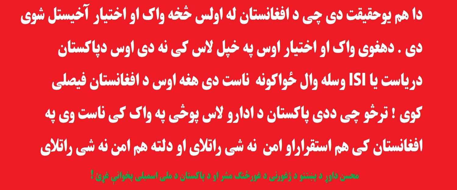 ترڅو پوری چی د افغانستان خاوره د پاکستان د” ریاست ” ISI له ګوډاګیانو څخه نه وی آزاد کړی ترهغی دلته امنیت نه شی راتلای !دا هم یوحقیقت دی چی د افغانستان له اولس څخه واک او اختیار آخیستل شوی دی . دهغوی واک او اختیار اوس په خپل لاس کی نه دی اوس دپاکستان دریاست یا ISI فورسیز ناست دی هغه اوس د افغانستان فیصلی کوی ! ترڅو چی ددی پاکستان د ادارو لاس پوڅی په واک کی ناست وی په افغانستان کی هم استقراراو امن نه شی راتلای او دلته هم امن نه شی راتلای . زما خپل تجویز دادی چی دا جرګه دی مطالبه وکړی چی د لوی جرګی له لاری په افغانستان کی د جمهوریت یا دموکراسۍ د بیرته بحالولو لپاره داجرګه خپل سفارش وړاندی کړی او دافغانستان د اساسی قانون د برحالولو لپاره باید چی دا جرګه یوجلا قرار داد دلته ” پاس” یعنی تصویب کړی چی دا دافغانستان د تاریخ او دا دافغانستان د هویت او داولس د واک او اختیار د ژوندی ساتلو او دهغی د استقرار د ساتلو وسیله ده چی دهغی پرته پښتانه د دنیا په یوه ګوټ کی هم د عزت او احترام ژوند نه شی کولای !