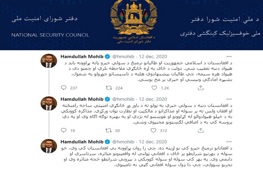 وقتی نتائج آخرین فیصله مورخ ۱۲ دسمبر سال ۲۰۲۰  جلسات گفتگو های صلح دوحه به سمع عضو ارتباط شورای امنیت افغانستان که لحظه به لحظه جلسات هیأت افغانستان را نظارت مینمودند رسانیده شد برخلاف انتظار هیأت گفتگوهای اعزامی صلح برای ایشان گفته شد که تمامی اعضای هیأت باید برای غرض آمادگی به دوردوم گفتگو ها ی صلح که در داخل افغانستان برگزار میگردد تا دوروز دیگر در کابل حضور داشته باشند در غیر آن از مشارکت در دوردوم گفتگو ها محروم ساخته خواهند شد که برخلاف اظهارات و فرمائیشات رئیس صاحب غنی تمامی اعضای هیأت متذکره نه بخاطر علاقه و محبت با میهن و مردم بلکه بخاطر کسب مواجبی که از بابت اشتراک درچنین  کنفرانس ها بدست می آورند توسط  طیاره شرکت هواپیمائی قطر از دوحه به کابل انتقال یافتند . وآیا  براستی هم  دوردوم کنفرانس متذکره در داخل افغانستان باید تدویر می یافت اما اینکه داستان اجرای گفتگو در داخل افغانستان چه بوده و  چگونه به همان محل اسبق اش یعنی دوحه قطر تغییر یافت حکایتی  است که از یک تویت آغاز شد تویتی که در یک صبح نسبتأ زمستانی حمدالله محب مشاور امنیت ملی افغانستان  درصفحه تویتراش نوشت “باید  مراحل بعدی وباقی مانده مذاکرات را در داخل افغانستان انجام یابند  و برای این مأمول دولت نیز حاضر به ایجاد هرگونه فضای امنیتی و همکاری های لوژستیکی درهر کجای کشور می باشد ….”اماهیچکسی ندانیست که چگونه تیوریی  انجام گفتگوهای صلح  بجای دوحه قطر در داخل افغانستان که دکتورین امنیتی چند سال قبل حکومت کابل پنداشته می شد ناگهان بنام طرح حمدالله محب مشاور شورای امنیت حکومت افغانستان مسمی ساخته شد ،آگاهان و تحلیل گران آنرا به دلائیل روشنی از قبیل رقابت وعداوت شخصی آقای حمدالله محب با زلمی خلیلزاد نمائنده وزارت خارجه امریکا برای صلح همچنان امضأ کننده توافق صلح با طالبان که می خواست با این طرح اقدامات آقای خلیلزاد رامورد پرسش قراردهد و ازسوی هم تلاش های پیگیرهمکاران شورای امنیت افغانستان برای ذهنیت سازی میان رهبران ورجال سیاسی افغانستان سبب گردید تا طرح شکست خورده انجام دوردوم مذاکرات در افغانستان بنام طرح  حمد الله محب  مشاور امنیت ملی افغانستان مسمی گردد .