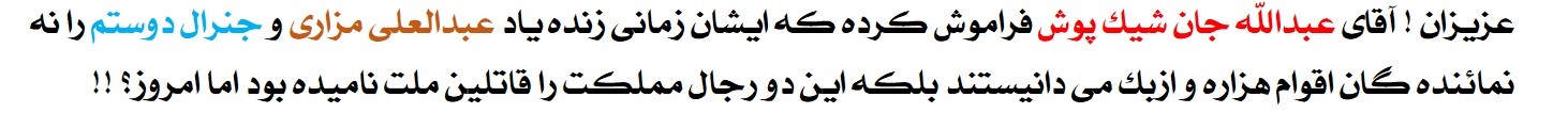 و حتی گاهی برای سرور قلب ملول و بیمار شان متوصل به داستان های غیر واقعی میگردند .توضیح واضحات پیرامون خبر فوق آن است که نه تنها عده ای کثیری از فرماندهان جنگ های تباه کننده درافغانستان وعبدالله عبدالله رئیس “شورای عالی معامله “در مراسم  پذیرائی و استقبال از دوستم این مارشال گلم جمعی حضور داشتند بلکه برخلاف آنچه که جلالتمآب عبدالله عبدالله رئیس شورای عالی معامله ” مصالحه ” جنرال دوستم را عامل قتل هزاران تن از ازبک های شریف این کشور خوانده بود این بار وی را الحاج مارشال عبدالرشید دوستم نامید واز شاکر کارگر که ازازبکتباران وابسته به جنبش رشید دوستم در ارگ محسوب میشود با چنین ادبیاتی درخواست بعمل آورد : از جناب کارگرصاحب برادر عزیز ما  شاکر کارگر رئیس دفتر مقام ریاست جمهوری اسلامی  افغانستان که تشریف دارند وفرمانی  قرئت میکنند حضورشانرا هم خیر مقدم میگوئیم …آقای شاکر کارگرکه گفته میشود آنگاهی که جنرال اسکات میلر به همراهی اسدالله خان خالد که وی نیز دارایی قصه های هزار شب خاصی است به  نزد جنرال دوستم  رفت برای اشرف غنی دستور داده شد تا شاکر کارگر را در جهت سهل کاریی امور به حیث رئیس دفتر به عنوان مهره ارتباطی جنرال اسکات میلردر   اما مسخره ترین استقبال غیرحضوری و نهایت متملقانه ای که متولی حرم سرای وهمسررولاجان سعد محمد اشرف غنی همزمان با اجلال نزول جلالتمآب الحاج پهلوان رشید خان دوستم برخاک مقدس کابلستان از پهلوان بعمل آورد حکایتی بوده که جناب محمد اشرف خان غنی از معده مبارکه اش در آورده  بود وهمیشه  به عنوان یک نسخه مجرب و کم هزینه  برای شکار وتطمیع مخالفان به کاربرده است  که جلالتمآب رئیس غنی بدون مقدمه و انگیزه خاطره چند سال قبل اش را که متعلق به دوران پرافتخار انتخابات  ریاست جمهوری اش بوده می فرمایند : درانتخابات ازمن سوال کردند که سیاست خارجی ات را ازکجا شروع میکنی ؟یاد تان هست که من گفتم ازترکمنستان!کلی نخندیدند ؟