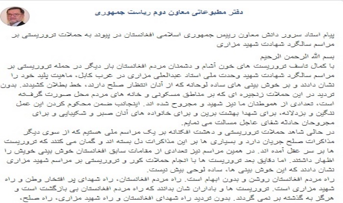 محمد سرور دانش معاون دوم رئیس غنی این حمله را با انتشار بیانیه ای محکوم کرد