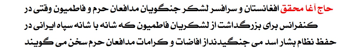 چنانچه ذکر شجاعت ها و دیگر فضائل لشکر فاطمیون که به هدایت مستقیم حاج آغا محقق و دیگرذوب شده گان در ولایت فقیه مطلقه به کمک سپاه پاسداران ایران ایجاد گردیده اند دریک سفر مأموریتی به کابل در گفتگوی مفصلی با یک شبکه تلویزیونی بیان داشته بود. این جواد خان ظریف که نه جوادت دارد و نه هم ظرافت و از کاسه لیسان درگاه ولایت است در پاسخ پرسش ژورنالیست نامور کشور جناب نجفی زاده گفته بود که : از اینکه فاطمیون در پایگاه های خودشان و سنگرهای خود شان پرچم افغانستان با عکس رئیس جمهور افغانستان بعضأ داشت واینها بهترین نیروهای هستند که اگر دولت افغانستان تمائل داشته باشند میتوانند با سابقه رزم با تروریستها و داعش به دولت افغانستان کمک کنند .
