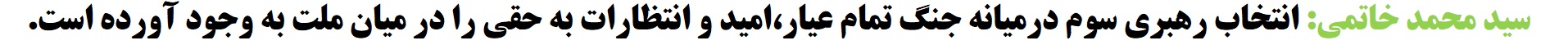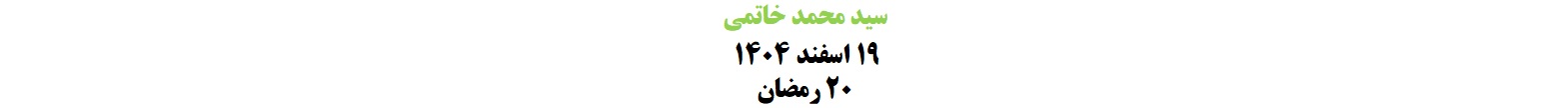 دکتر سید محمد خاتمی بنیانگذار نظریه ء گفتگوی تمدنها و از متفکران نواندیش جهان اسلام شناخته میشود که مدت هشت سال ریاست جمهوری ایران را برعهده داشت و هم اکنون نیروهای اصلاح طلب ایران را رهبری میکند با ؤقوع جنگ خونین و حملات جنگنده های صهیونیزم جهانی برهبریی امریکا و رژیم غاصب اسرائیل و به شهادت رساندن آیت الله خامنه ایی رهبرجمهوریی اسلامی ایران و انتخاب جوانی از سلاله خامنه ای بنام مجتبی خامنه ایی از سوی مجلس شورای خبرگان رهبریی انتخاب گردید پیامی فرستاده است که میتوان گفت آن پیام رهنمودی برای آغاز کار رهبرجدید خواهد بود . پیام جناب سید محمد خاتمی بدین شرح است :
