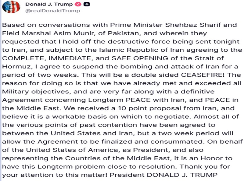 در ژرفنای تاریخ بشریت واژه خونین ” نه ” گفتن که ازهابیل نخستین فرزند آدم آغاز میشود به مثابه مظهر آزادی و استقلال ملتها شناخته شده وبه قول بزرگی ملتی زنده می ماند که برای دفاع از ناموس اش یکپارچه در قربانگاه حضور داشته باشند و ملت رشید ایران که مصداق این حقیقت اظهر من الشمس است و در برابر قدرت های تا دندان مسلح امریکا و رژیم کودک کُش اسرائیلی با تنهایی و مظلومیت درمیدان نبرد خون با شمشیر حضور یافت . سرانجام دشمن زبون که تا آخرین لحظات نیز از شعار های مفتکی چون ” یک تمدن محو خواهند شد ” هنوز رنگ این اظهارات دونالد ترومپ نه خشکیده بود که سرانجام در اوج این گونه شعار ها یی تروریستی که بیشتر مصرف داخلی داشته تا اینکه واقعأ عملی گردد بازاز طریق شبکه ثروت که با این فرعون زمان تعلق دارد نوشت :بر اساس گفتوگوها با شهباز شریف و عاصم منیر از پاکستان داشتم و در آن از من درخواست کردند نیروی مخربی را که قرار بود امشب به ایران اعزام شود متوقف کنم، و مشروط به اینکه جمهوری اسلامی ایران با بازگشایی کامل، فوری و ایمن تنگه هرمز موافقت کند، من موافقت میکنم که بمباران و حمله به ایران را برای مدت دو هفته به حالت تعلیق درآورم. این یک آتشبس دوطرفه خواهد بود!