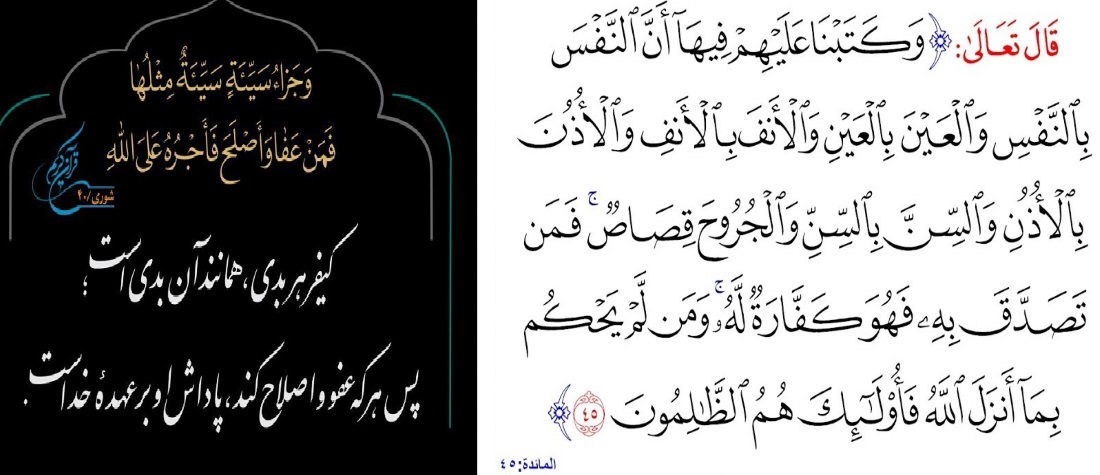 وَکَتَبْنَا عَلَیْهِمْ فِیهَا أَنَّ النَّفْسَ بِالنَّفْسِ وَالْعَیْنَ بِالْعَیْنِ وَالأَنفَ بِالأَنفِ وَالأُذُنَ بِالأُذُنِ وَالسِّنَّ بِالسِّنِّ وَالْجُرُوحَ قِصَاصٌ فَمَن تَصَدَّقَ بِهِ فَهُوَ کَفَّارَهٌ لَّهُ وَمَن لَّمْ یَحْکُم بِمَا أنزَلَ اللّهُ فَأُوْلَئِکَ هُمُ الظَّالِمُونَ
