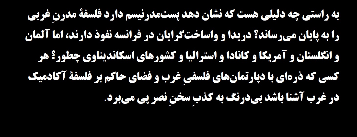 (۶) به راستی چه دلیلی هست که نشان دهد پستمدرنیسم دارد فلسفۀ مدرنِ غربی را به پایان میرساند؟ دریدا و واساختگرایان در فرانسه نفوذ دارند، اما آلمان و انگلستان و آمریکا و کانادا و استرالیا و کشورهای اسکاندیناوی چطور؟ هر کسی که ذرهای با دپارتمانهای فلسفیِ غرب و فضای حاکم بر فلسفۀ آکادمیک در غرب آشنا باشد بیدرنگ به کذبِ سخنِ نصر پی میبرد. اکنون پیروانِ همۀ نحلههای فلسفی اعم از نوکانتیها، نوهگلیها، نوتوماسیها، هیومیها، نوارسطوییها، هایدگریها، ویتگنشتاینیها و دیگران در صحنۀ فلسفۀ غرب حضور دارند. نسل نوینی از دانشورانِ جوان از آرای ارسطو و کانت (۷) متأثّراند و اکنون طیفِ گستردهای از مکاتب، سنتها و جنبشهای فلسفیِ مدرن سهمی از بازار فلسفه را در اختیار خود دارند. فلسفۀ تحلیلی و قارهای در آلمان و فرانسه تدریس میشوند و در انگلستان و آمریکا نیز فلسفۀ تحلیلی و قارهای حضور دارند. از قضا آنچه در «صحنۀ فلسفی همگانی» چندان دیده نمیشود حکمت خالده و طرفدارانِ آن است.نمونۀ دوم حقیقتاً ادّعای غریب و شگفتانگیزی است. بنا به ادّعای نصر، فیلسوفان غربی (هیوم و کانت و هگل و اسپینوزا و لایبنیتس و …) از عقل و یافتههای تجربی استفاده میکنند، امّا فیلسوفانِ سنتی مثل ابن سینا و فارابی و ملاصدرا و سهروردی و میرداماد و فلوطین و … از عقل و یافتههای تجربی مدد نمیگیرند بلکه ایدههای خود را از «سرچشمهای فرافردی» دریافت میکنند. گمان نمیکنم توضیح بیشتری در اثباتِ کذبِ این مدّعا ضروری باشد (مگر آن که نصر مرادی کاملاً متفاوت داشته باشد).نمونۀ سوّم فارغ از آن که پرمدّعایانه است، نکتۀ دیگری هم در بر دارد که ما را به نقدِ دوممان، یعنی «تصویر نادرست از اسلام و سنت»، برمیگرداند. بیایید فرض کنیم که برای مثال «قاعدۀ الاتفاقی» واقعاً راهحلِ خوبی برای مسئلۀ استقراست، یا «عرض لازم» (که از جوهرْ تفکیکناپذیر امّا خارج از ذاتِ آن است) حقیقتاً پاسخی عالی به مسئلۀ امکانِ حکمِ ترکیبیِ پیشینِ کانت است. اکنون پرسش این است: