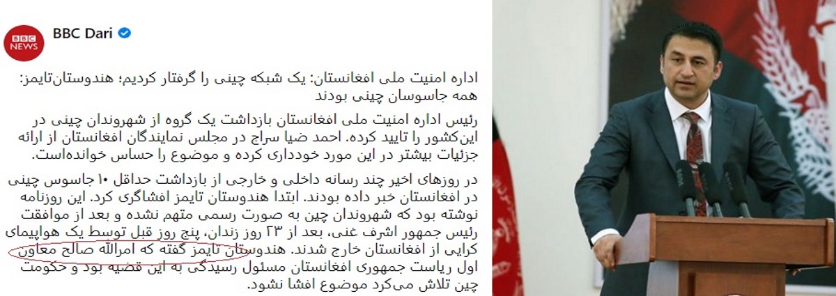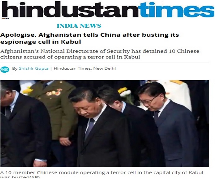 این یادداشت را به خبر مندرج درهندوستان تایمز ودیگر رسانه های تصویری هندوستان اختصاص داده ایم که این روزنامه بروایت منابع امنیتی در کابل و دهلی نو که کشور های جنوب غرب آسیا را مورد مطالعه قرار میدهند گزارش داده بودند که ده تن از جاسوسان چینائی وابسته به وزارت امنیت چین MMS توسط اداره امنیت ملی افغانستان National Directorate of Security به اتهام انجام ترورها و پخش دهشت افگنی در شهر کابل بازداشت گردیدند .