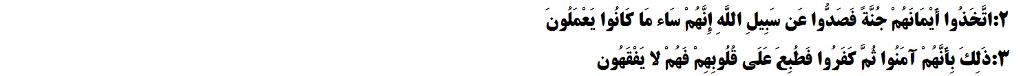 درسـت اسـت كـه در بـعـضـى از مـواقـع ، انـسـان چـاره اى جـز سـوگـنـد نـدارد، و يـا لااقل سوگند كمك به بيان اهميت موضوع مورد نظر مى كند، ولى نه سوگند دروغ ، و نه سوگند براى هر چيز و هر كار كه اين شيوه منافقان است . در آيه 74 سوره توبه مى خوانيم يحلفون بالله ما قالوا و لقد قالوا كلمةالكـفـر: (آنها به خدا سوگند ياد مى كنند كه (سخنان زننده در غياب پيامبر) نگفته اند، در حالى كه قطعا سخنان كفرآميز گفته اند). مـفـسـران بـراى جمله (صدوا عن سبيل الله )، دو معنى ذكر كرده اند: نخست اعراض از راه خـدا و ديـگـر بـازداشـتن ديگران از اين راه ، گرچه جمع ميان هر دو معنى در آيه مورد بحث امـكـان پـذيـر اسـت ، ولى بـا تـوجـه بـه تـوسـل آنها به سوگندهاى دروغ ، معنى دوم ، مـنـاسـبـتـر بـه نـظـر مـى رسـد، چـرا كـه هـدف از ايـن سـوگـنـدهـا، اغفال ديگران است . يـك جـا (مـسـجـد ضـرار) بـر پـا مـى كـنـنـد، و هـنـگـامـى كـه از آنـهـا سـؤ ال مى شد هدفتان چيست ؟ سوگند ياد مى كنند كه جز هدف خير ندارند! (توبه – 107). در جـاى ديـگـر بـراى شـركـت در جـنـگـهـائى كـه فـاصـله آن نـزديـك و احـتـمـال غـنائم در آن زياد است اظهار آمادگى مى كنند ولى براى شركت در ميدان تبوك كه پـر از مشكلات است هزار عذر و بهانه مى آورند و سوگند ياد مى كنند كه اگر توانائى مى داشتيم همراه شما حركت مى كرديم ! (توبه – 42). آنها نه فقط براى مردم سوگند دروغين ياد مى كنند بلكه همانگونه كه در آيه 18 سوره مـجـادله آمـده در عـرصـه مـحـشـر نـيـز در پـيـشـگـاه خـداونـد مـتـوسـل بـه سـوگـنـد دروغ مـى شـونـد! و ايـن نـشـان مـى دهـد كـه ايـن عـمـل جـزء بـافـت وجـودشـان شـده است كه حتى در عرصه محشر و در پيشگاه خدا نيز دست بردار نيستند!. آيـه بـعد به علت اصلى اين گونه اعمال ناروا پرداخته مى افزايد: (اين به خاطر آن اسـت كه آنها نخست ايمان آوردند، سپس كافر شدند، و لذا بر دلهاى آنها مهر نهاده شده و حقيقت را درك نمى كنند) (ذلك بانهم آمنوا ثم كفروافطبع على قلوبهم فهم لا يفقهون ). جمعى از مفسران معتقدند كه منظور از اين ايمان در اينجا ايمان ظاهرى است ، در حالى كه در باطن كافر بودندولى ظـاهـر آيـه نشان مى دهد كه آنها در آغاز حقيقتا مؤ من شدند، و بعد از آن كه طعم ايمان را چـشـيدند و نشانه هاى حقانيت اسلام و قرآن را ديدند راه كفر را پيش گرفتند، اما كفرى تـواءم بـا نفاق ، نه آشكارا و با صراحت ، و همين سبب شد كه خدا حس تشخيص را از آنها سـلب كـنـد، و از درك حـقـائق مـحـروم بـمـانـنـد، زيـرا اگـر از اول حـق را تـشـخـيـص نداده بودند عذرى داشتند، اما بعد از تشخيص حق و ايمان آوردن اگر به آن پشت پا بزنند خداوند توفيق را از آنها سلب مى كند. در حـقـيـقـت مـنافقان دو گروهند، گروهى از اول ايمانشان صورى و ظاهرى بوده ، و گروه ديـگـر در آغـاز ايـمان حقيقى داشته اند سپس راه ارتداد و نفاق را پيش گرفته اند، ظاهر آيه مورد بحث گروه دوم را مى گويد. در حـقـيـقـت ايـن آيه شبيه آيه 74 سوره توبه است كه مى گويد: و كفروا بعد اسلامهم : (آنها پس از اسلام كافر شدند). بـه هـر حـال ايـن سـومـيـن نـشـانـه از نـشـانـه هاى آنها است كه از درك حقائق روشن غالبا مـحـرومند، و ناگفته پيدا است كه اين هرگز منتهى به جبر نمى شود چرا كه مقدمات آن را خودشان فراهم كرده اند. آيـه بـعـد نـشـانـه هاى بيشترى را از آنها ارائه داده ، مى گويد: (هنگامى كه آنها را مى بينى جسم و قيافه آنان تو را در شگفتى فرو مى برد) (و اذا راءيتهم تعجبك اجسامهم ). ظاهرى آراسته و قيافه هائى جالب دارند. علاوه بر اين چنان شيرين و جذاب سخن مى گويند كه (وقتى حرف مى زنند تو نيز به سخنانشان گوش فرا مى دهى )! (و ان يقولوا تسمع لقولهم ). جـائى كـه پـيامبر (صلى الله عليه و آله و سلم ) ظاهرا تحت تاءثير جذابيت سخنان آنها قرار گيرد تكليف ديگران روشن است .ايـن از نـظـر ظـاهر و اما از نظر باطن (گوئى چوبهاى خشكى هستند كه بر ديوار تكيه داده شده است ) (كانهم خشب مسندة ).اجـسـامـى بـى روح ، و صـورتـهـا