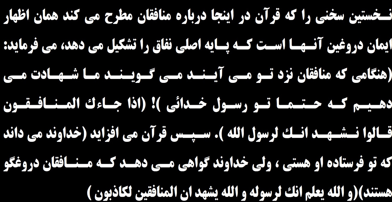 ۱ – هـنگـامى كـه مـنـافـقـان نـزد تـو مى آيـنـد مـى گويند ما شهادت مى دهيم كه حتما تورسـول خدائى – خداوند مى داند كه تو قطعا رسول اوهستى ولى خداوند شهادت مى دهد كه منافقان دروغگو هستند. ۲– آنـهـا سـوگـنـدهايشان را سپر ساخته اند تا مردم را از راه خدا بازدارند، آنها كارهاى بسيار بدى انجام مى دهند. ۳ – اين به خاطر آن است كه آنها نخست ايمان آوردند سپس كافر شدند، لذا بر دلهاى آنها مهر نهاده شده ، و حقيقت را درك نمى كنند. ۴ – هنگامى كه آنها را مى بينى جسم و قيافه آنان تو را در شگفتى فرو مى برد، و اگر سخن بگويند به سخنانشان گوش فرا مى دهى ، اما گوئى چوبهاى خشكى هستند كه بر ديـوار تـكـيـه داده شـده ، هـر فـريادى از هر جا بلند شود بر ضد خود مى پندارند، آنها دشـمنان واقعى تو هستند از آنان برحذر باش ، خداوند آنها را بكشد چگونه از حق منحرف مى شوند؟تفسير: سرچشمه نفاق و نشانه هاى منافقان ! مساءله نفاق و مـنـافـقـان در اسـلام از زمـانـى مطرح شد كه پيامبر (صلى الله عليه و آله و سلم ) به مـديـنـه هجرت فرمود و پايه هاى اسلام قوى ، و پيروزى آن آشكار شد، و گرنه در مكه تـقريبا منافقى وجود نداشت ، زيرا مخالفان قدرتمند هر چه مى خواستند آشكارا بر ضد اسـلام مى گفتند، و انجام مى دادند، و از كسى پروا نداشتند و نيازى به كارهاى منافقانه نبود. امـا هـنـگـامـى كـه نـفوذ و گسترش اسلام در مدينه دشمنان را در ضعف و ناتوانى قرار داد ديگر اظهار مخالفت به طور آشكار مشكل ، و گاه غير ممكن بود،و لذا دشـمـنـان شكست خورده براى ادامه برنامه هاى تخريبى خود تغيير چهره داده ، ظاهرا بـه صـفـوف مـسـلمـانـان پـيـوسـتـنـد، ولى در خـفـا بـه اعمال خود ادامه مى دادند. اصولا طبيعت هر حرکت انقلابى چنين است كه بعد از پيروزى چشمگير با صفوف منافقان روبرو خـواهـد شـد، و دشـمـنـان سـرسـخـت ديـروز بـه صـورت عـوامـل نـفـوذى امـروز در لبـاس دوستان ظاهرى جلوه گر مى شوند، و از اينجا است كه مى تـوان فـهـمـيـد چـرا ايـنـهـمـه آيـات مـربـوط بـه مـنـافـقـيـن در مـديـنـه نازل شده نه در مكه . اين نكته نيز قابل توجه است كه مساءله نفاق و منافقان مخصوص به عصر پيامبر (صلى الله عـليـه و آله و سـلم ) نـبـود، بـلكـه هـر جـامعه اى – مخصوصا جوامع انقلابى – با آن روبرو هستند، به همين دليل بايد تحليلها و موشكافيهاى قرآن را روى اين مساءله نه به عـنـوان يك مساءله تاريخى ، بلكه به عنوان يك مساءله مورد نياز فعلى ، مورد بررسى دقـيـق قـرار داد، و از آن براى مبارزه با روح نفاق و خطوط منافقين در جوامع اسلامى امروز الهام گرفت . و نيز بايد نشانه هاى آنها را كه قرآن به طور گسترده بازگو كرده است دقيقا شناخت ، و از طريق اين نشانه ها به خطوط و نقشه هاى آنها پى برد. نكته مهم ديگر اينكه خطر منافقان براى هر جامعه از خطر هر دشمنى بيشتر است ، چرا كه از يـكـسو شناخت آنها غالبا آسان نيست ، و از سوى ديگر دشمنان داخلى هستند، و گاه چنان در تار و پود جامعه نفوذ مى كنند كه جدا ساختن آنها كار بسيار مشكلى است و از سوى سوم روابط مختلف آنها با ساير اعضاء جامعه كار مبارزه را با آنها دشوار مى سازد. به همين دليل اسلام در طول تاريخ خود بيشترين ضربه را از منافقان خورده ، و نيز به همين دليل قرآن سختترين حملات خود را متوجه منافقان ساخته و آن قدر كه آنها را كوبيده هيچ دشمنى را نكوبيده است . با توجه به اين مقدمه به تفسير آيات باز مى گرديم : نـخستين سخنى را كه قرآن در اينجا درباره منافقان مطرح مى كند همان اظهار ايمان دروغين آنـهـا اسـت كـه پـايه اصلى نفاق را تشكيل مى دهد، مى فرمايد: (هنگامى كه منافقان نزد تـو مـى آيـنـد مـى گـويـنـد مـا شـهـادت مـى دهـيـم كـه حـتـمـا تـو رسـول خـدائى )! (اذا جـاءك المـنـافـقـون قـالوا نـشـهـد انـك لرسول الله ). سـپـس قرآن مى افزايد (خداوند مى داند كه تو فرستاده او هستى ، ولى خداوند گواهى مـى دهـد كـه مـنـافقان دروغگو هستند)(و الله يعلم انك لرسوله و الله يشهد ان المنافقين لكاذبون )