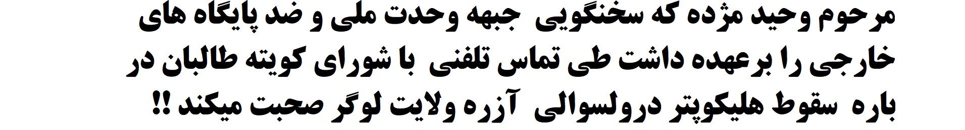 جالب وسخت شگفت انگیز آنجاست که باری در زمان جمهوریت بیست ساله ارباب حامد خان کرزی و اشرف خان غنی احمدزی دریک عملیات نیروهای ائتلاف بین المللی ” ایساف ” در ولسوالی آزره ولایت لوگر یک پروند هلیکوپتر نیروهای مذکور که سقوط نموده بود که پیوست با ان مرحوم وحید مژده سخنگویی جبهه وحدت ملی و ضد پایگاه های امریکا برهبریی مرحوم انجنیر احمد شاه احمدزی طی یک تماس تلیفونی با شورای کویته طالبان چنین اظهارداشته بود