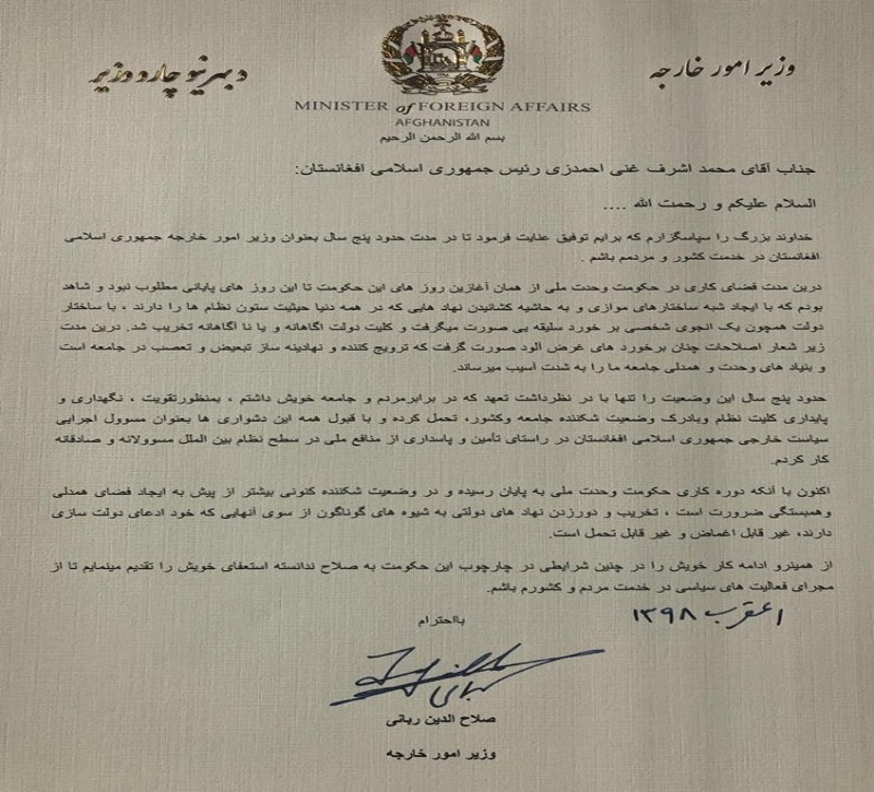 جناب آقای داکتر محمد اشرف غنی احمدزی رئیس جمهوری اسلامی افغانستان! السلام علیکم و رحمه الله و برکاته؛خداوند را سپاسگذارم که برایم توفیق عنایت فرمود تا حدود پنج سال به عنوان وزیر امورخارجه جمهوری اسلامی افغانستان، در خدمت کشور و مردمم باشم.در این مدت، فضای کاری در حکومت وحدت ملی، از همان آغازین روزهای این حکومت تا این روزهای پایانی، مطلوب نبود. در این مدت شاهد بودم که با ایجاد شبه ساختارهای موازی و به حاشیه کشاندن نهادهایی که در همه نظام های دنیا حیثیت ستون نظام ها را دارند، با ساختار دولت همچون یک انجوی شخصی برخورد سلیقه یی صورت می گرفت و کلیت دولت آگاهانه و نا آگاهانه تخریب شد. در این مدت زیر شعار اصلاحات، چنان برخوردهای غرض آلودی صورت گرفته که در دراز مدت،ترویج کننده و نهادینه ساز تبعیض و تعصب در جامعه است و بنیادهای وحدت و همدلی جامعه ما را به شدت آسیب می رساند.حدود پنج سال، همهی این وضعیت را تنها به خاطر تعهدی که در برابر مردم و جامعه خویش داشتم، به منظور نگهداری کلیت نظام و جلوگیری از شکنندگی جامعه و کشور تحمل کرده و با قبول دشواری های زیادی به عنوان مسئول اجرایی سیاست خارجی جمهوری اسلامی افغانستان در راستای تأمین و پاسداری از منافع ملی در سطح نظام بین الملل مسئولانه کار کردم.اکنون با آنکه دوره کاری حکومت وحدت ملی به پایان رسیده و در وضعیت شکننده کنونی بیشتر از پیش به ایجاد فضای همدلی و همبستگی ضرورت است، تخریب نهادهای دولتی به شیوه های گوناگون از سوی آنهایی که خود ادعای دولت سازی دارند، غیر قابل اغماض و غیر قابل تحمل است.از همین رو ادامه کار خویش را در چنین شرایطی در چارچوب این حکومت به صلاح ندانسته، استعفای خویش را تقدیم می نمایم تا از مجرای فعالیت های سیاسی، در خدمت مردم و کشور باشم.