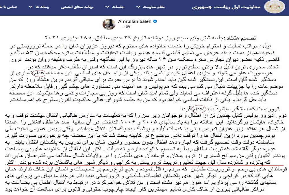 وقتی رییس عمومی امنیت ملی بودم چندین مورد ازین انتقال ها را توقف دادم. موضوع در کابینه بحث شد که با این معضله چه برخوردی صورت گیرد. متاسفانه دولت وقت تصمیم گرفت که اجازه دهد اطفال بدون حضور والدین شان برای تدریس به پاکستان انتقال یابند. به عباره دیگر گفته شد که تربیت اطفال ربط به تصمیم خانواده دارد و نه دولت . اکثر این اطفال از خانواده های بی بضاعت بودند. اکنون وقتی من سوانح شماری از تروریستان و قوماندان های طالبان را در ولایات شمال مطالعه می کنم همان هایی اند که پانزده و شانزده سال قبل جهت تعلیم و تربیت تروریستی به کراچی و دیگر شهر های پاکستان برده شده بودند. اکثر قوماندان های بی رحم و تروریست طالبان که مردم را قتل نموده و هیچ نوع رحم بر تاسیسات و انسان این خاک ندارند همان هایی اند که در کراچی و دیگر شهر های پاکستان تعلیمات طالبانی و تروریستی دیده اند. هرچند ما بهای بی پروایی های سالهای گذشته را می پردازیم اما هنوز هم دیر نشده است و من تلاش خواهم کرد در ارتباط به انتقال اطفال بی بضاعت به مراکز طالبانی بیرون از خاک کاری نمایم. مهمترین کار ایجاد چارچوب حقوقی و قانون برای ممانعت آن خواهد بود……ملاحظه فرمودید که این سومین متفکرافغانستان چه کشف های می فرمایند ؟ به ، به خدایا سایه این متفکر استخباراتی را از سر مردم ما کم ….با دریغ وتأسف که نه میداند ویاهم فراموش کرده که وقتی دومین متفکرجهان حضرت اشرف غنی دامت برکاته برای اینکه بردیانت ومطالعات دینی اش درجامعه عقب نگهداشته شده افغانستان فخر فروشی کند و طوری وانمود کند که گویا ایشان در علوم دینی به سطح وسیع مطالعاتی دارد از همین مدارسی که حضرت امرالله خان صالح آنرا مراکز تروریستی می خواند به عنوان مدارسی که برای یکسال تمام در پنج مدرسه کراچی و لاهور پاکستان درس سیرت النبی فرا گرفته است یاد می فرمایند .حضرت امرالله خان کسی که تازه به مقام جلادی رسیده است با ید بداند که چرا گناه شکست ها و غفلت های خویش را به گردن دیگران می اندازید و یادت باشد هرگاه خشمگین میشوی قبل از انجام هرکاری و نوشتن هر فرمانی تا ده بشمار و با تأمل بنویس که برای سلامتی وجود نازنین ات ضرری نداشته باشد !